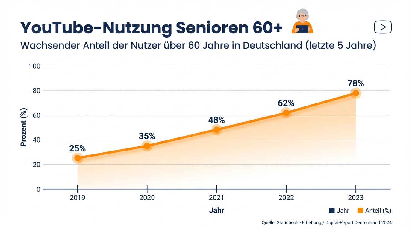 Die Bemühungen von YouTube haben Früchte getragen. Die Plattform ist bei älteren Erwachsenen so beliebt wie nie zuvor. Aktuelle Studien zeigen ein klares Bild: Die Generation 60+ hat YouTube für sich entdeckt und ist eine der am schnellsten wachsenden Nutzergruppen. Während anfangs nur wenige Senioren online Videos schauten, sind es heute Millionen, die die Plattform täglich nutzen.